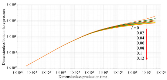 The constant exponential matrix shrinkage model was selected to study the effect of matrix shrinkage on dimensionless bottom-hole pressure. In order to facilitate the study, the ratio of internal and external permeability was set as 1; that is, the mean value model was reduced. The matrix shrinkage coefficient I increases from 0 to 0.12 at a rate of 0.02. When I is 0, there is no shrinkage effect. The unit of the I value is %/pa (Figure 22).