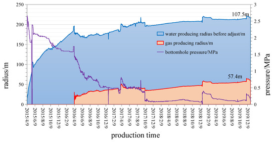 Stage 3: The gas–water two phase flow stage, in which the adsorbed gas in the coal seam is desorbed from the matrix to free gas and flows into the reservoir to the wellbore. In this stage, the production is carried out according to the predicted stable production period of the coalbed methane well. The dividing point between stage 3 and stage 4 is bottom-hole flow pressure. The stable gas production process of a coalbed methane well is the process of flow pressure exchange for gas production. When the bottom-hole flow pressure is reduced to atmospheric pressure and cannot be further reduced, the CBM well enters stage 4 from stage 3; that is, it moves from the stable production stage to the decline stage.