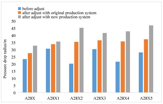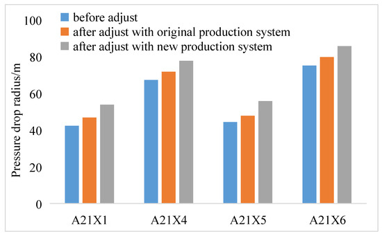 On the basis of the same geological model, different pressure control times were set to simulate the reservoir pressure drop during production. The final pressure drop funnel shows that when the pressure control time of well A is 4 months, the final pressure drop funnel is the lowest, and the reservoir desorption effect is the best (Figure 9 and Figure 10).