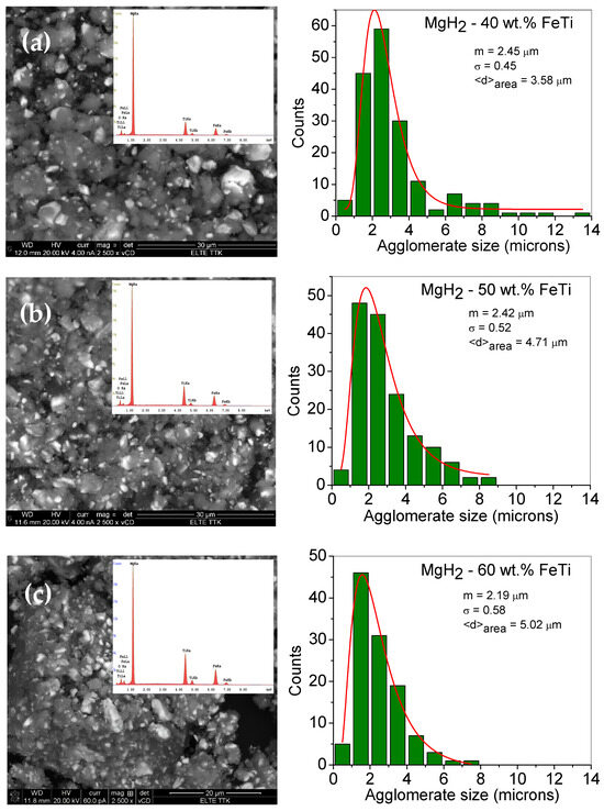 Low-magnification SEM images of the ball-milled (a) M gH2-40 wt.% FeTi (b) MgH2-50 wt.% FeTi and (c) MgH2-60 wt.% FeTi composite powders. The insets show the corresponding EDS spectra. The right-hand side images present the particle size histograms with a fitted lognormal-distribution function.