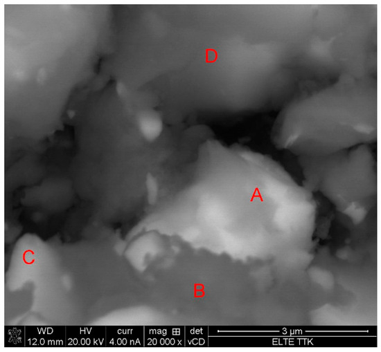 Supplementary point-like EDS analysis revealed significant compositional differences between the brighter and darker spots. As listed in Table 2, heavier Fe and Ti elements mostly dominate the brighter areas (particle A), while the darkest region (denoted by B) is enriched in Mg, corresponding to a MgH2 agglomerate or layer surrounding the catalyst particle. Regions C and D exhibit intermediate concentrations, presumably due to the overlapping of FeTi and MgH2 particles within the range of the electron penetration depth.