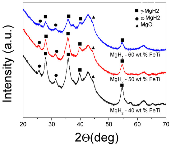 The XRD patterns of the milled MgH2-FeTi powder composites are presented in Figure 3. As one can observe from the diffractograms, each powder exhibits the reflections of tetragonal α-MgH2; however, the high-pressure metastable γ-MgH2 phase is also present as a minor component. All peaks are broader, which is indicative of extensive crystallite size reduction [32]. It is also noted that peak intensities significantly decrease in height with increasing FeTi content, and, at the same time, no Bragg peaks of any Fe-Ti phase are visible, which could correspond to a solid state amorphization of the catalyst, as can be confirmed by the broad halo developed at around 2θ = 42 deg [69]. In addition, a reflection centered at 2θ = 44 deg is present for all the powders, corresponding to the formation of some MgO.