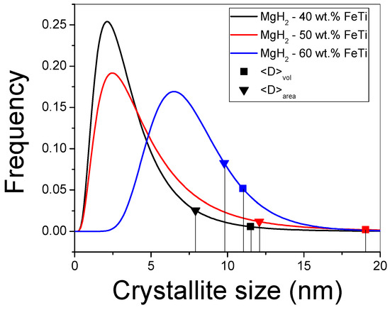 By applying mCMWP and σCMWP via Equation (1), the G(x) lognormal size-distribution functions can be constructed for all the composites (see Figure 5). Due to the largest mCMWP value being for the MgH2-60 wt.% FeTi alloy, its histogram is shifted toward higher values, and its maximum occurs at around 7 nm. The corresponding ⟨D⟩area area-averaged particle size and ⟨D⟩vol volume-averaged crystallite sizes were also determined (see Equations (2) and (3)); these values are also listed in Table 3 and represented by symbols in Figure 4. In accordance with the broad Bragg peaks observed in Figure 3, all the characteristic values are in the nanometric range (8–19 nm), which correspond to an intensive nanocrystallization during the HEBM process and are in agreement with other MgH2-based hydrogen-storage alloys processed by HEBM [30,32,52]. In particular, a 9 nm final crystallite size of MgH2 was achieved after prolonged milling time (24 h) [55], confirming our previous statement that there exists an optimal milling time for achieving the best overall microstructure from the point of view of hydrogenation performance [52,65,68]. As a consequence of the nanocrystallization process, the relative volume fraction of the grain boundaries inside the individual powder particles increases significantly, and these grain boundaries, with distorted atomic bonds and smaller atomic density [29], can act as fast diffusion channels for hydrogen. In a recent research study, it was determined that FeTi catalyst powder particles can not only induce the nanostructural refinement of MgH2 via HEBM, but they can also promote the abundant formation of lattice defects like dislocations [52]. These lattice defects can further enhance the hydrogen kinetic performance of MgH2 [28,30].