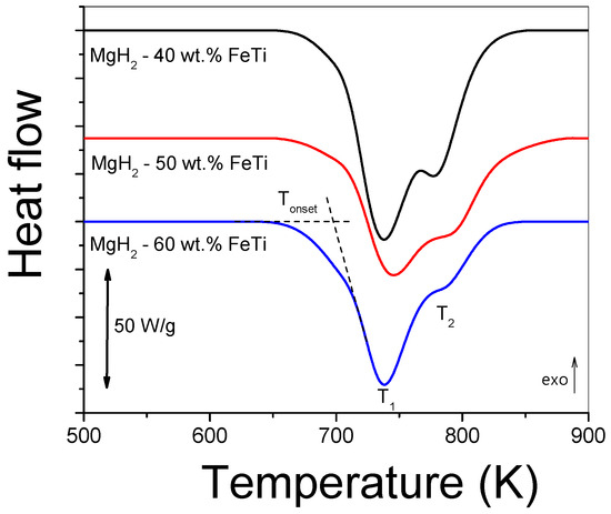 Linear-heating DSC scans for MgH2-FeTi powders obtained at 40 Kmin−1.