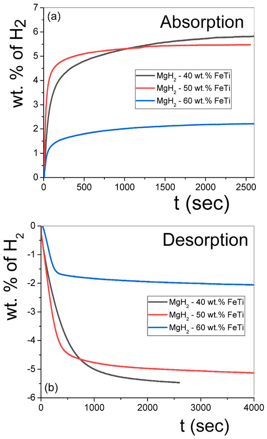 In our opinion, this dependency on the FeTi content may be explained by the increased amount of mechanical contact between the pre-milled FeTi particles and MgH2 aggregates during the co-milling step. For the MgH2-40 wt.% FeTi sample, the MgH2 agglomerates were predominantly formed around the individual FeTi particles (Figure 1a); however, in the MgH2-60 wt.% FeTi composite, the MgH2 particles tended to aggregate around the FeTi ones (Figure 1c). This behavior is also supported by the variation in the MgH2-particle size distribution. Namely, the smallest value (σSEM = 0.45) for the MgH2-40 wt.% FeTi composite corresponds to a relatively sharper and more homogeneous distribution, while the value of σSEM = 0.58 for MgH2-60 wt.% FeTi describes a wider distribution.