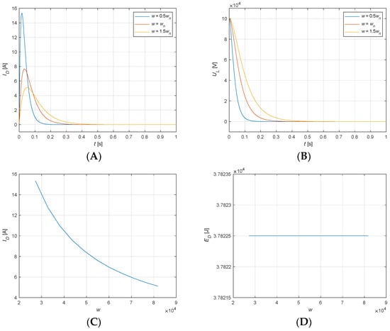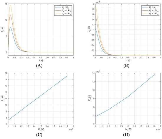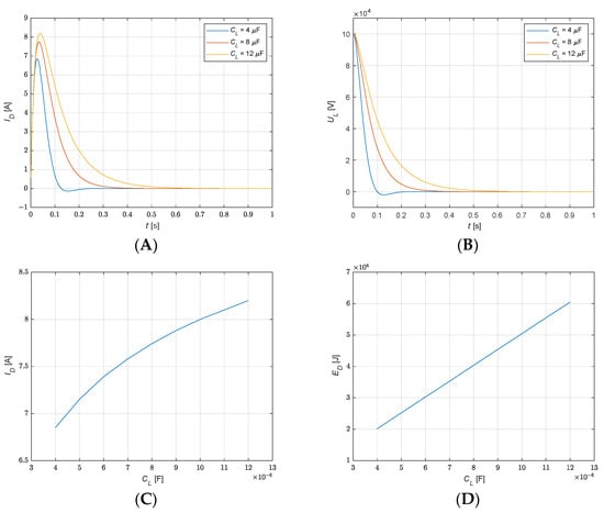 Figure 3 shows the influence of capacitance on all relevant discharge parameters. The basis for this analysis, as well as others within this chapter is unit 1, as per Table 1. As can be seen, the peak value of current ID has a nonlinear relationship with capacitance CL, but a higher capacitance also contributes to a higher current. On the other hand, the total energy ED has a linear relationship with capacitance, which is logical from Equation (1). In short, this means that a discharge of a higher capacitance value of capacitance will also cause a higher temperature rise in the winding. Furthermore, as seen in Figure 3B, a higher capacitance will take a longer time to discharge. In the considered case, the difference can be as high as 400 ms.