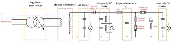 Regardless of the test approach used, the test circuit remains conceptually the same. The test circuit used on all tests presented within this paper is shown in Figure 6. The basic principle is that a combination of capacitance of an impulse generator is used to achieve the required capacitance CL. That configuration is then charged at the required voltage through a step-up transformer. By connecting the controllable spark gap, the trapped charge is discharged over the test object. The discharge current is measured at the shunt connected to the end of the primary winding. A similar approach was used in []. What is not shown in the diagram is the DC circuit for recording the cooling curve of the winding. This is a same, well-known circuit commonly used when performing conventional temperature rise tests, so it was not specifically listed here.