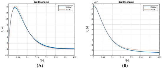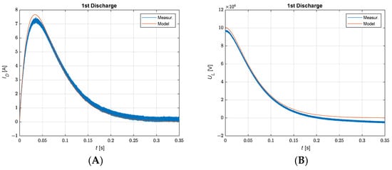 Comparison of measured and modelled discharge parameters. (A) Discharge current waveshapes, (B) discharge voltage waveshapes.