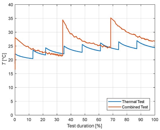 The second stipulation is the difference between temperature rise in the thermal portion of the first test and the combined sequence. Again, this is showcased on unit 1. Figure 8 shows the comparison of cooling curves recorded during both tests. A ten-minute recording period was used between discharges in both cases. Since the test duration was not equal, with the thermal test lasting roughly 83 min and mechanical test lasting 30 min, the duration on the horizontal axis of Figure 8 is specified relatively. Further analysis of the data is given in Table 5. There are several conclusions that can be drawn from this data. The first is that using simple calculations gives results for individual discharges very comparable to measured values (roughly 10% difference). The second is that the combined test sequence yields a greater temperature rise than the thermal test sequence. The third conclusion is that if adiabatic conditions are assumed, all approaches yield similar values of θ1. The assessment was performed assuming an average winding temperature rise of 65 K and ambient temperature of 40 °C.