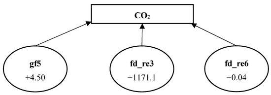 Graphical representation of the functional dependency of carbon dioxide on green investments and renewable energy development. CO2—Carbon dioxide (CO2) emissions, kt; gf5—Annual investment in off-grid renewable energy, USD million; fd_re3—The first differences in off-grid capacity of renewable energy, MW; fd_re6—The first differences in installed renewable energy-generating capacity in developing countries, watts per capita. Source: Authors’ results.