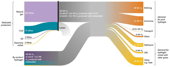 Hydrogen value chains in today’s world [69]. Mtoe—million tonnes of oil equivalent. Mt—million tonnes. Source: IEA (2019) The Future of Hydrogen, https://www.iea.org/reports/the-future-of-hydrogen (accessed on 21 October 2023).