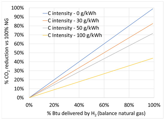 Replacing natural gas and coal with hydrogen combustion would reduce emissions by 7 kg of CO2 per kg of H2 and 12 kg of CO2 per kg of H2, respectively [74]. Blending hydrogen generated with different carbon intensities and at different energy-based concentrations with natural gas (i.e., % energy delivered by individual fuels) can influence the overall carbon emission reduction capability, as shown in Figure 6. Blending of hydrogen with different carbon footprints in the range of 0–100 g of CO2e emissions per kilowatt-hour of energy utilized will yield different levels of carbon reduction potential compared to natural gas utilization.