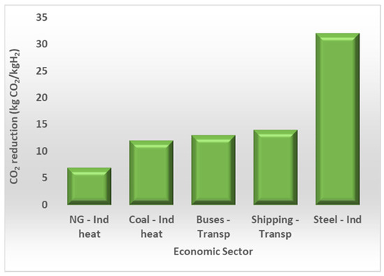 For instance, Figure 7 displays the impact of displacing fossil fuels in sector specific applications with zero-carbon, green hydrogen. As shown, each kilogram of green hydrogen has the potential to eliminate 7–12 kg of CO2 in fossil fuel powered industrial heating equipment. Similarly, 13–14 kg of carbon dioxide emissions can be eliminated per every kilogram of hydrogen utilized in replacing fossil fuel consumption in the transportation sector. The steel industry has the potential to reduce carbon emissions by as much as 32 kg of CO2 equivalent per kilogram of hydrogen employed in the steel processing phase [75].