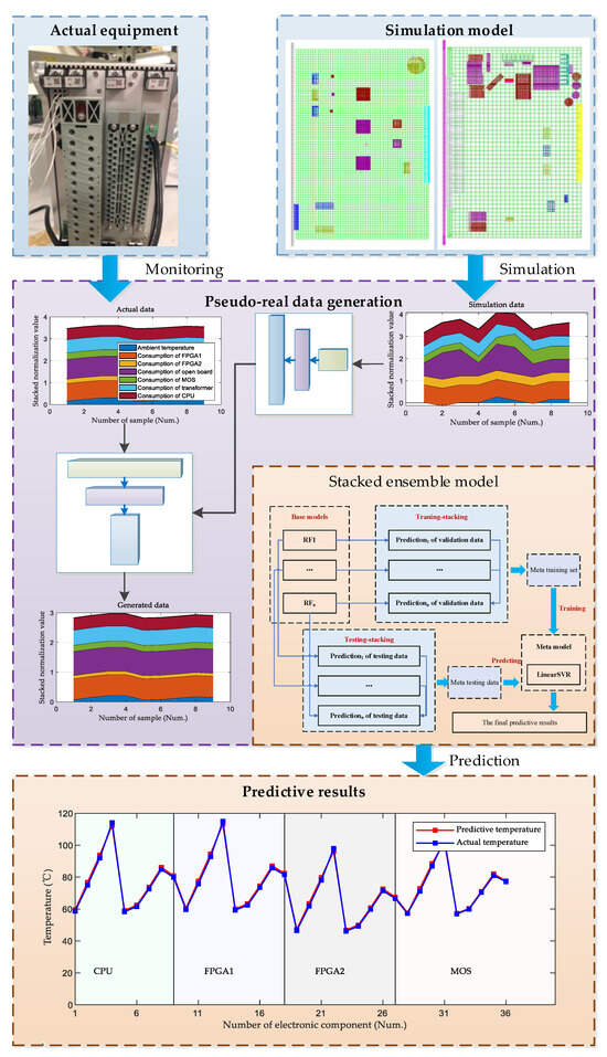 In recent years, by utilizing IoT technology and sensor networks, the comprehensive monitoring and data collection of RPE have accumulated massive data resources [15,16]. Then, with the help of intelligent technology, the fast prediction of the hotspot temperature of RPE becomes possible. This type of method is called data a driven-based method, which means staff do not need to have a detailed understanding of the heating mechanism, they just need to master the data-driven approach [17]. By training the monitoring data, an intelligent technology can build predictors, based on which the future thermal development of electronic devices can be easily predicted [18]. It can be seen that the quality of monitoring data directly affects the predictive accuracy. In general, recording enough data to train a predictive model is difficult, especially when electronic components are packaged inside larger device. Lacking efficient data is a general defect in machine learning tasks, which usually leads to noise and no-labeling [19]. In response to this, researchers have proposed numerous techniques to improve the availability of monitoring data, such as data generation, semi-supervised learning and transfer learning [20,21]. Among them, generative adversarial networks (GAN) have acquired much attention in recent years due to their excellent capacity for data generation. GAN mainly have two structures, namely, generator and discriminator. Via the adversarial training of a generator and discriminator, GAN can generate fake data that are very similar to real data [22,23]. They can thus alleviate the problem of data deficiency. When generating data, existing studies usually use rand noise, which may lack generation guidance. Simulation data were used as the input of the generator of the GAN in this study. This leads to feature transfer between simulation data and actual data. Furthermore, a predictor, can be built by the training of regression technology, such as support vector machine (SVM), random forest (RF), extreme learning machine (ELM), etc. Given that one model cannot behave well in all situations, a stacked ensemble model was built in this study.