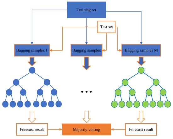 Random forest was first proposed by Breiman in 2001 [24]. It is based on decision trees and incorporates random selection attributes during training through bagging techniques. Random forest is a set of ensemble algorithms that have the characteristics of simple principles, easy implementation, and low computational complexity. We have already demonstrated its excellent performance in classification and regression tasks. It is known as “the method representing the level of ensemble learning technology”. The structure of RF is shown in Figure 4.