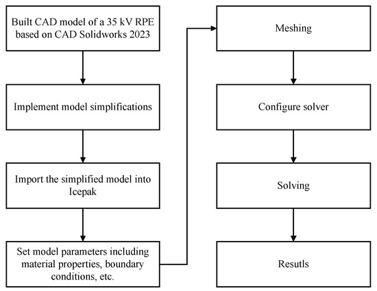 Correspondingly, a finite element simulation model was built in Icepak. The simulation flow is shown in Figure 6. It should be noted that some simplification was performed to improve computational speed and ensure final convergence. Specifically, the components and simplified features that do not affect heat dissipation according to the principle of maximizing the preservation of the original heat dissipation path were deleted during the modeling of the box. And during the modeling of the PCB boards, the high-loss electronic components and gas-hinder electronic components were left, while the low-loss and gas-hinder-free electronic components were deleted. The consumption of the deleted electronic components is integrated into that of the PCB board.