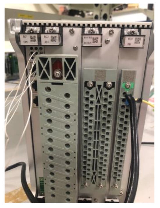 On the other hand, the proposed data generation model requires real data. RPE with some temperature measurement probes attached was put in a high–low-temperature test box. The specific measurement positions are shown in Figure 8 (corresponding to Figure 7). The attached temperature measurement probes, which correspond to the numbers 1, 2, 3, and 4 in Figure 8, were used to measure the temperatures of the CPU, FPGA1, FPGA2, and MOS tube, respectively. And Figure 9 shows the lead out position of the signal lines used for temperature probes. It should be noted that the temperatures of electronic components can be measured up until the point at which the RPE has operated at the set ambient temperature for over an hour. The ambient temperatures were set at 30 °C, 45 °C, 50 °C, 55 °C, and 80 °C to measure the thermal characteristics of the RPE.