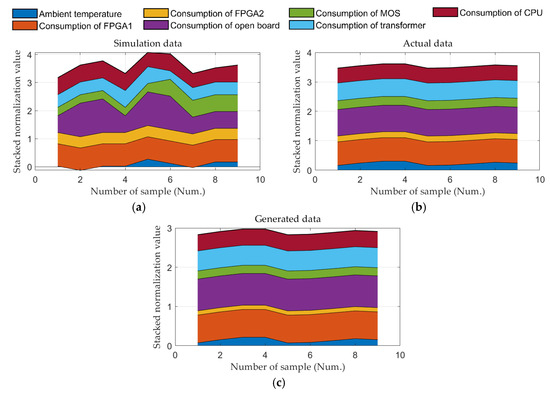 Taking FPGA1 as an example, Figure 10 show the characteristic maps of measured data, simulation data, and generated data (partial data), respectively. Intuitively, there is a certain similarity between the generated data, simulation data, and measured data. The data distribution between the generated data and the real data shown in Figure 10 has significant similarity.