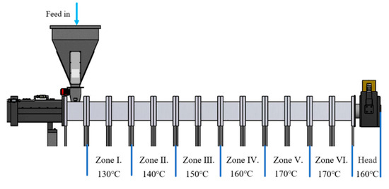 The blend materials were fed into the feeding port of the parallel twin-screw extruder, according to the ratios specified in Table 1, with a screw speed of 30 rpm. The temperature settings are illustrated in Figure 1. Subsequently, the extruded materials underwent water cooling and pelletization to produce the blend-modified HDPE composite materials. Further, the materials were placed in various molds according to the thickness requirements and molded at 140 °C by hot pressing with a stepwise pressure increase of 5 MPa, 10 MPa, and finally 15 MPa after initially completely melting the material under 0 MPa pressure. After thermal compression molding, the specimens were water-cooled to room temperature. The prepared samples were subjected to vacuum treatment at 80 °C in a vacuum oven for 48 h to eliminate internal stresses.