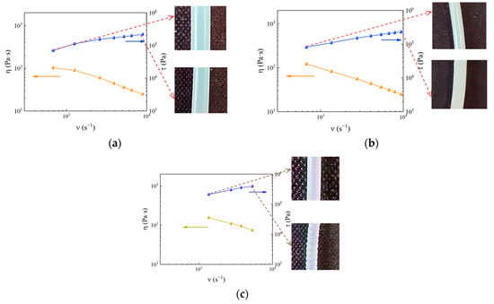 Initially, the rheological characteristics of the three fundamental materials, HDPE, LLDPE, and cPE-A, were tested, and the results are depicted in Figure 2. From the graph, it can be observed that the viscosity of all three materials decreases with increasing shear rate, exhibiting evident pseudoplastic fluid behavior. Among the three base resins, cPE-A demonstrates the highest shear stress and is more prone to experiencing melt fracture phenomena. Within the tested shear rate range, both HDPE and LLDPE exhibit smooth melt surfaces without melt fracture. In contrast, cPE-A exhibits pronounced melt fracture at a shear rate of 3.6 × 103 s−1, indicating inferior extrusion performance.