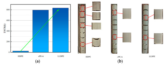 Environmental stress cracking resistance of HDPE/cPE-A and HDPE/cPE-A/LLDPE. (a) Resistance to environmental stress cracking time; (b) environmental stress cracking test diagram.