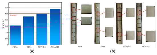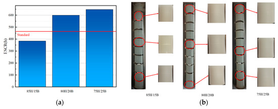 The ESCR times for the seven HDPE composite materials are depicted in Figure 4 and Figure 5. In Figure 4, it is evident that the ESCR times of the blend-modified materials are significantly higher compared to the HDPE materials, which exhibited cracking at 26 h. In Figure 4a, as the HDPE component decreases to 40%, the ESCR time of 4H/6A increases to 356 h. Introducing LLDPE with more branches without changing the proportion of HDPE further enhances the ESCR characteristics to over 500 h. In Figure 5a, adding a relatively small amount of cPE-B achieves a significant improvement, with ESCR times exceeding 600 h for 80H/20B and 75H/25B. According to the standard, the time for any specimen to exhibit cracking (F0) should exceed 21 days (504 h). Based on the test results, 4H/4A/2LL, 4H/3A/3LL, 80H/20B, and 75H/25B all meet the requirements.