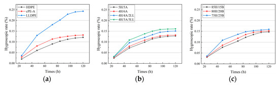 Water resistance properties of base resins and composites. (a) Water resistance characteristics of polyethylene materials with different densities; (b) water resistance properties of HDPE/cPE-A and HDPE/cPE-A/LLDPE; (c) water resistance characteristics of HDPE/cPE-B.
