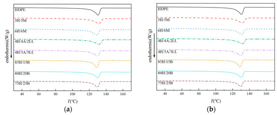 DSC curves for each sample: (a) melting curves and (b) crystallization curves, which were tested in the temperature range of 30 °C to 170 °C.