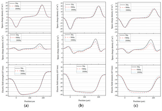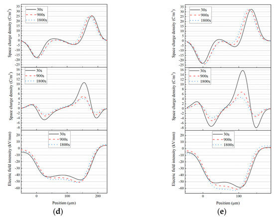 The space charge testing is based on the principle of the pulse electroacoustic (PEA) method, with a polarizing field strength of 40 kV/mm. The polarization duration is set at 1800 s, followed by the removal of the DC high voltage and short-circuiting the high voltage electrode to ground, and then the testing period is established at 1800 s. The specimen thickness is 200 μm. This procedure allows for the acquisition of information regarding the distribution of space charge and electric field within the specimen during the polarization and short-circuiting processes.