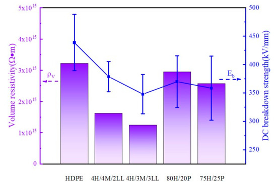 The results of DC breakdown strength and volume resistivity tests for HDPE and four composite materials are presented in Figure 9. The findings indicate a significant decrease in characteristic breakdown strength and volume resistivity for composite materials compared to HDPE. The variation in volume resistivity reveals that the HDPE/cPE-B composite system maintains a higher volume resistivity, while the HDPE/cPE-A/LLDPE ternary blend experiences a noticeable decrease, closely associated with changes in crystallinity and crystal size in the modified materials. The HDPE/cPE-B material, with poor compatibility due to the presence of a two-phase interface, generates structural defects that induce shallow traps, resulting in a higher direct current resistivity than the HDPE/cPE-A material. DC breakdown strength testing reveals a significant reduction in characteristic breakdown strength for the four composite materials modified from HDPE. Among them, 4H/4A/2LL and 4H/3A/3LL show a less pronounced decrease compared to the cPE-B blend, with a dispersion of breakdown strength superior to the cPE-B blend. Due to the better compatibility of HDPE/cPE-A compared to HDPE/cPE-B composite materials, the two-phase interface is more compact. However, the introduction of cPE-A material also reduces the crystallinity of the composite material. The increase in the proportion of the amorphous region expands the free volume of the blend, increases the average free path of electrons, leading to an increased probability of high-energy electrons, and results in a decrease in breakdown strength. However, the reduction is lower than that in the HDPE/cPE-B composite material. This is because the elastic cPE-B material has a more significant impact on the crystallinity of HDPE material, and cPE-B uses more catalysts in the synthesis process, thereby significantly degrading the dielectric strength of the material [23]. In summary, considering the insulation layer requirements for submarine composite optoelectronic cables, all four composite materials maintain high DC resistivity and withstand electrical strength, meeting the operational demands of the cable.