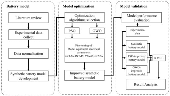 This section describes the methodology for developing the proposed lithium battery model and its improvement using optimization algorithms. The methodology is shown in Figure 1. As can be seen in the mentioned figure, the methodology starts with a literature review and model development. The proposed battery model is a “synthetic” model since it is based on experimental data and reported results from different authors [,,,]. The proposed battery model is based on an equivalent hybrid electrical circuit model, which includes the development of electrical and electrochemical equations. After the battery model was obtained, the model was optimized by implementing the PSO and GWO optimization algorithms to find the best combination of the proposed equivalent electric circuit of the model. For the validation stage of the methodology, the model was validated using experimental data and compared to the PSO- and GWO-improved models.