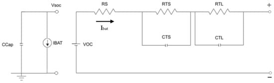 The proposed model considers that specific parameters change over time, resulting in a dynamic open-circuit voltage (VOC) as the state of charge (SOC) varies. A diagram of the proposed electrical model is shown in Figure 2. IBAT is the current. The model was validated in two scenarios, at different load ratios from 0.5 A to 5 A in increments of 0.5 A and constant temperature, and at different temperature values from −20 to 60 °C in increments of 20 °C and constant load ratio, to observe the model’s behavior under different operation conditions.