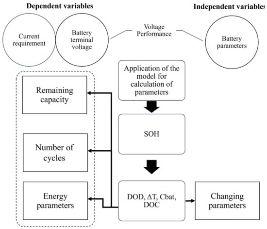 Figure 3 illustrates the principles applied in formulating the equations for this model. The equations were formulated after identifying the main dependent and independent variables and parameters involved in lithium-ion battery dynamics. The proposed model acknowledges that specific parameters exhibit variations over time when dealing with a lithium-ion battery. Consequently, features like state of charge undergo fluctuations, introducing dynamism to the open-circuit voltage (VOC).