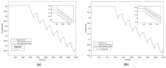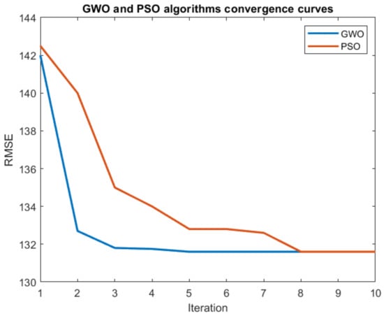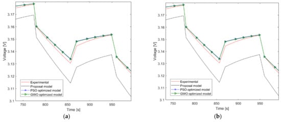 In the context of recent research on lithium-ion battery modeling, optimization algorithms play a crucial role in tuning the model parameters to improve the accuracy and performance of the battery’s models []. Several optimization techniques have been employed, including gradient-based optimization [], genetic algorithms [], and swarm intelligence-based algorithms. Among these algorithms, Particle Swarm Optimization (PSO) [,] and Grey Wolf Optimizer (GWO) [] have emerged as promising tools for optimizing model parameters in lithium-ion battery modeling. These algorithms have demonstrated their effectiveness in various engineering applications [], showing their efficiency in the adjustment of system parameters, as in [], where several bio-inspired optimization methods were applied and compared for the design of optimal Maximum Power Point Tracker—Proportional-Integral-Derivative (MPPT PID) controllers for renewable energies, showing a better performance than classical methods. They, therefore, can potentially improve the accuracy of lithium-ion battery models []. However, there is limited research comparing the performance of PSO and GWO in the context of lithium-ion battery modeling and simulation [].