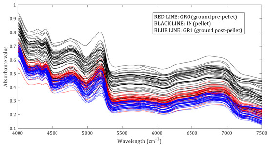 A prior spectral analysis was performed to detect the differences in the spectral responses the between samples at each process step (according to the definitions of GR0, IN and GR1). To provide a better visualization, the entire spectral range (4000–10,000 cm−1) was cut at 7500 cm−1 due to the presence of noise in the last part. As shown in Figure 1, the IN spectra revealed higher scattering related to the cylindrical shape, which led to the greater interference of light. The GR0 and GR1 spectra revealed homogeneous and grouped spectra, due to the dry and ground physical conditions. Furthermore, little spectral differences could be detected between 5000 and 5200 cm−1, where the O–H bonds, related to water content, were concentrated. This assumption supported the use of NIR to detect the relationship between physical and chemical characteristics [53], explaining the slightly higher moisture content in the IN samples than in the ground ones due to moistening before pelletization. No evident differences between the spectra were detected between the V and T groups.