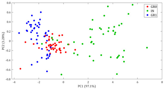 PCA was carried out to investigate the separation between V and T according to the spectral data. The spectra were pretreated to remove scattering effects and to enhance the useful information. Two different separations were considered according to (i) the physical conditions (GR0, IN and GR1) and (ii) the classification of the origin (V and T); for both, the spectral range was cut at 7500 cm−1. The results of the separation according to the physical condition are presented in the score plot (Figure 2) and the loading plot (Figure 3). The best model was developed only with the average of the spectral replicates. In fact, the first principal component (PC) explained the highest variance (97.10%) related to the main physical difference between the IN and GR groups, and the consequent interaction between the light source and the cylindrical shape of the pellets, which could favor the penetration of external light during the NIR analysis. The second PC only explained a limited residual part (1.28%) that could be related to the chemical differences of the samples (wood components and the presence of glue). Nevertheless, the chemical separation was almost completely hidden by the physical features.