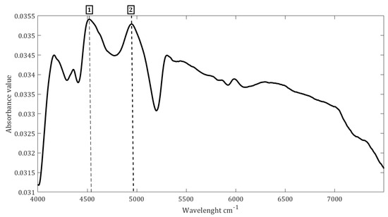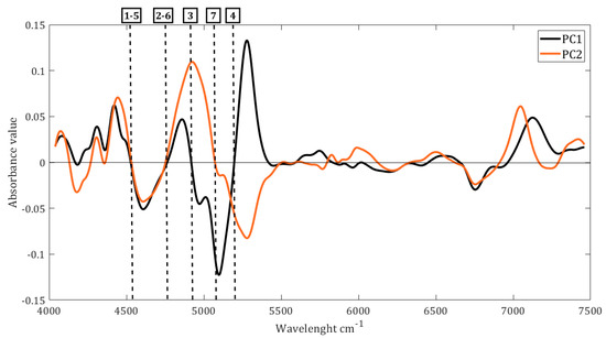 In this separation, different components could be involved, as shown in Figure 5. The peak at 4532 cm−1 of PC1 (1) is probably the same shared with the peak at 4528 cm−1 of PC2 (5) and associated with the C–H stretching bond and C=O bonds [55]. A spectral shift also occurred for the peak at 4768 cm−1 of PC1 (2) and the peak at 4752 cm−1 of PC2 (6), both of which are associated with cellulose, and thus to C–H and O–H deformation and to O–H stretching vibrations [56]. Lastly, the peak at 4916 cm−1 (3) and the one at 5196 cm−1 (4), both for PC1, are associated with C–H deformation and the O–H stretching of lignin and cellulose, and water (O–H bonds), respectively [49,57]. In PC2, the peak at 5068 cm−1 (7) is associated with water, and thus with O–H stretching and deformation bonds [56]. Water’s presence was confirmed as one of the main discriminative parameters due to the relevant difference between the ground material, considered to be dry, and the IN samples, where the addition of water (up to about 12%) permitted cohesion of the fine particles during the pelletization process. This result also corroborated the IN spectral peak around 5000 cm−1, as shown in Figure 1.