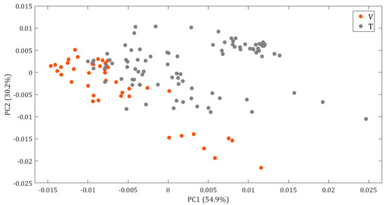 PCA was carried out to assess the visual separation between V and T, and it was performed on mean-centered data. Specifically, the graphical visualization of the samples’ separation and the assignment of the influence of chemical components were shown in the score plot and loading plot of the best pretreated model. Subsequently, PLS-DA was performed as the classification method, which was based on the relationship between the spectral data and the dependent variable, namely, a binary dummy variable that specified whether the sample belonged (value 1) or did not belong (value 0) to a specific group [43,44]. A confusion matrix (Table 2) was developed to assess the number of correctly and incorrectly classified samples. The sum of correctly classified samples is expressed as TP (true positive) and TN (true negative) samples, whilst the sum of FN (false negatives) and FP (false positives) represent the incorrectly classified fraction. The plot of sensitivity (true positive rate or TPR) versus 1-specificity (false positive rate or FPR) was used to construct the receiver operating characteristics (ROC) curve, where the area under the curve showed the accuracy of classification, and thus the model’s ability to discriminate between two different classes. Accuracy was also calculated as the sum of TN and TP samples (correctly classified samples) divided by the total of the dataset. The ROC curve’s value was considered as the threshold of decision, so when ROC = 0.5, the model was not able to divide the samples into classes and only random separation occurred. The closer the curve was to the upper lefthand corner in the space (TPF = 1 and FPR = 0), the greater the discriminant capacity [45].