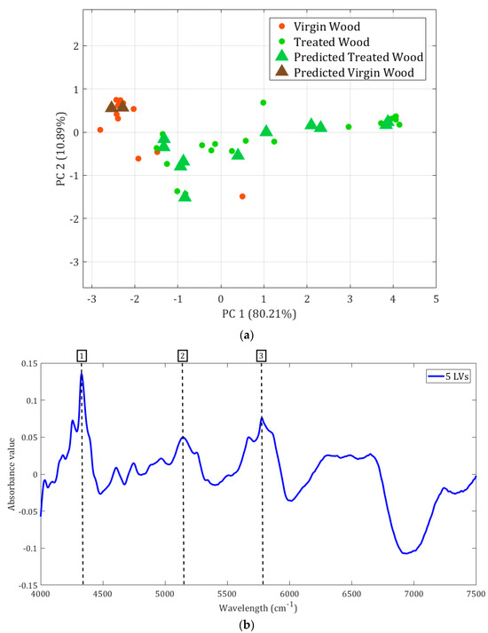 Although the same highest value of accuracy was obtained for each classification model at each step (accuracy = 1 and misclassification = 0), the best one was with the GR0 dataset according to the model’s results and the error. The spectra were pretreated with SNV after averaging of the spectral replicates. The lower performance of IN models was related to the higher scattering effect due to the cylindrical shape of the intact pellets, which facilitated the formation of random holes during the placement of the sample in the spectrophotometer’s cup. The physical condition of ground pellets led to a more homogeneous distribution, avoiding the interference of external light. Moreover, Figure 6a,b shows the score plot and the regression vector plot of the GR0 model. The PC1 mostly explained the dataset’s variability, related to the degree of industrial treatment. The samples’ distribution revealed a net separation between virgin wood, which was more homogenous, and the treated group, which varied along PC1. Furthermore, test samples were correctly classified following the distribution of each group, confirming the model’s results. One virgin sample (oak) was detected and removed as an outlier, while the mixed softwood sample was placed close to the treated group, confirming the chemical differences between hardwood and softwood and the use of residual fir in the wood industry [33,54]. The main peaks detected in the regression vector plot (Figure 6b) revealed that the wood component and the influence of water were involved in the separation. Specifically, the peak at 4328 cm−1 of PC1 (1) is associated with the C–H bonds of holocellulose [49], and the peak at 5776 cm−1 (3) is related to cellulose and associated with the first overtone of the C–H stretching bonds. Nevertheless, the difficulties of interpretation in the range of 5000–4000 cm−1 could lead to improper identification of the components [56] but could be related to N–H vibrations associated with formaldehyde [58]. The effect of water is related to the peak at 5144 cm−1 (2), and thus to the stretching and deformation of O–H bonds [55], despite it being less evident due to the dry condition of the GR samples.