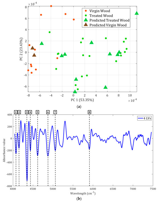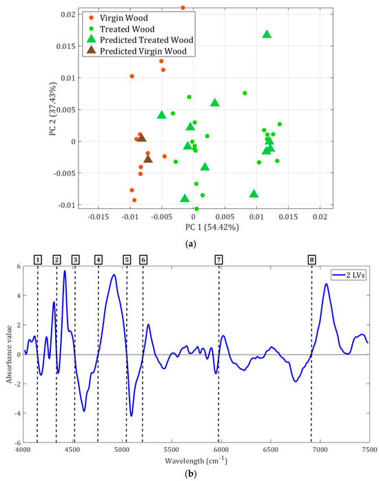 According to the GR1 and IN classification models, lower classification performances were obtained for the IN dataset, due to the higher spectral noise. Averaged spectra replicates of GR1 were pretreated with second derivatives (Savitzky–Golay filter, second-order polynomial, 21 smoothing points). Figure 7a,b shows the score plot and the regression vector plot of the GR1 model. PC1 explained 53.35% of the variance, followed by 23.43% explained by PC2. The samples’ distribution revealed an unclear separation between virgin wood, located in the negative PC1 but also the positive PC2, and treated group, which showed the formation of smaller groups of samples, probably related to different degrees of industrial treatment. The test samples also showed a similar distribution, confirming the good performance of the model and its classification accuracy, which was similar to that of GR0. For this reason, no outliers could be clearly detected. The main peaks detected in the regression vector plot (Figure 7b) revealed the influence of the main wood components but also of the water at 5056 cm−1 (7), associated with O–H stretching and deformation [56], while the peak at 5908 cm−1 (8) is related to the first overtone of C–H bonds, probably associated with lignin [55]. The peak at 4076 cm−1 (1) is associated with the C–H and C-C bonds of carbohydrates [56], while the peak at 4152 cm−1 (2) and at 4872 cm−1 (6) is related to cellulose, and thus to O–H and C–H stretching and deformation bonds [54]. The peak at 4352 cm−1 (3) is associated with C-O, C–H2 and also O–H vibrational bonds [57]. The peaks detected at 4436 cm−1 (4) and 4616 cm−1 (5) were noteworthy, probably related to the presence of glue; therefore, they are associated with N–H and C–H2 bonds, confirming the presence of industrially treated material [49].