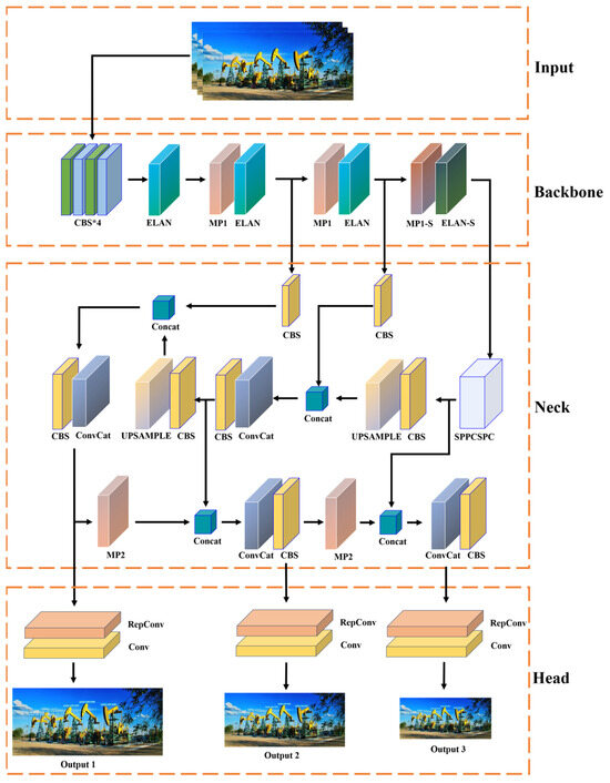 This study delves into the exploration based on YOLOv7, a model that demonstrates significant advantages in the domain of object detection. Contrasted with YOLOv5, YOLOv7 exhibits improvements in both precision and speed in object detection. Testing on the MS COCO dataset indicates that YOLOv7-X reduces parameters by 22% and computations by 8% compared to YOLOv5-X, while increasing the average precision (AP) by 2.2%. Renowned for its speed and efficiency, YOLOv7 achieves more accurate detection of small and occluded targets through innovative designs such as multi-scale fusion and path integration. Its end-to-end training strategy and adaptability to various target sizes make the model perform exceptionally well in complex scenarios. However, YOLOv7’s performance may decrease when dealing with dense targets. Additionally, in scenarios with complex backgrounds and low contrast, YOLOv7’s detection accuracy may be compromised. This study, building upon the strengths of YOLOv7, addresses its shortcomings with targeted improvements, further enhancing the accuracy and stability of the object detection model in the context of oilfield development. The YOLOv7SAC network structure designed in this study is shown in Figure 1.