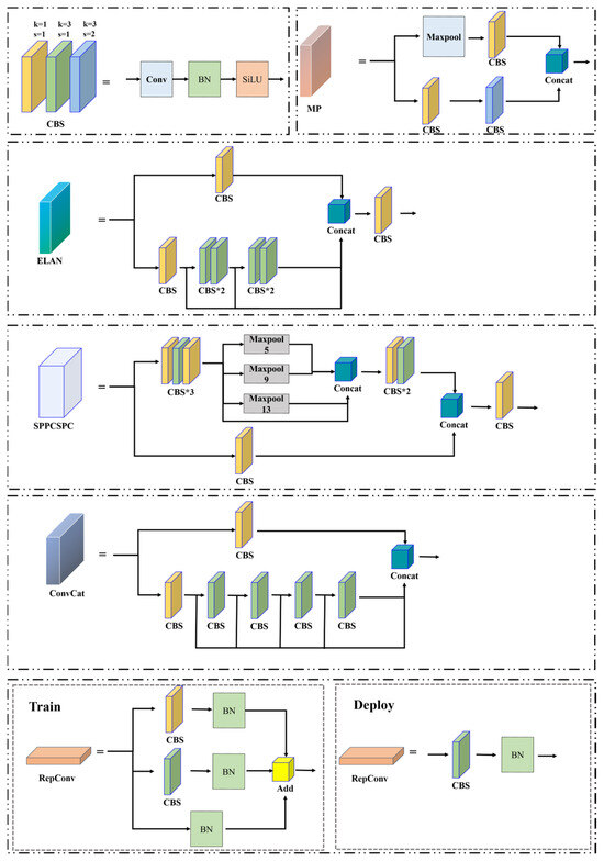 For the three differently sized feature maps output by the neck network, YOLOv7SAC designs the structured re-parameterized convolution using the RepConv structure [20] without direct connection, which increases training time but greatly improves inference performance [21]. In the training process, the entire module is divided into multiple identical or different module branches. In addition, 3 × 3 CBS convolution with batch normalization, 1 × 1 CBS convolution with batch normalization, and batch normalization layers when the input and output channels are the same are added to obtain the training model. In the inference process, the three parts are re-parameterized and their parameters are equivalently converted to another set of parameters using a 3 × 3 CBS convolutional module output. Then, the multi-branch training model is transformed into a high-speed single-branch inference model. The deployed model retains the high accuracy and other excellent characteristics of the multi-branch model while maintaining efficiency. It achieves a good balance between speed and accuracy, thereby improving network performance.