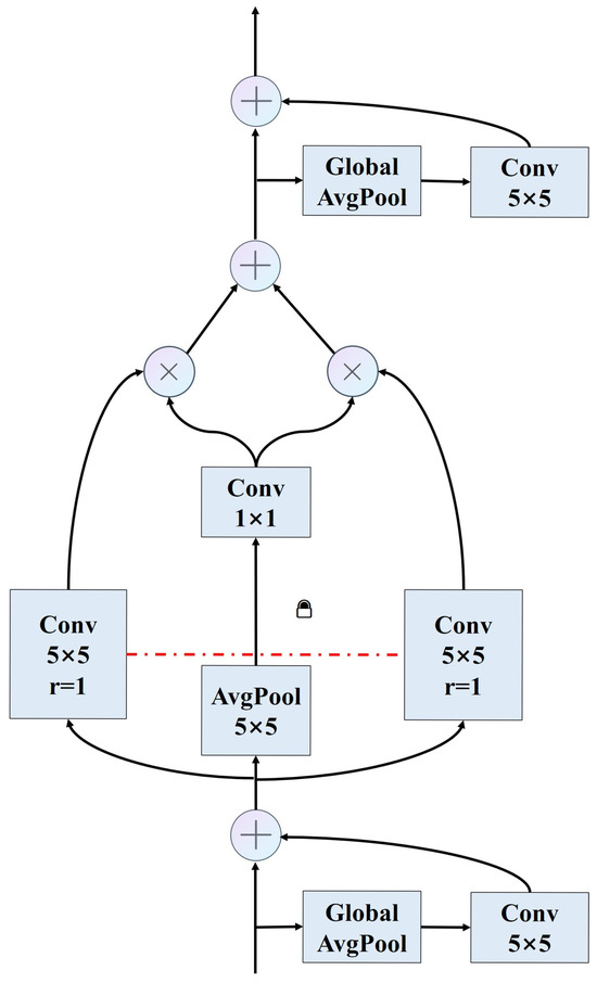 where x is the input; w is the weight; r is the void ratio of the void convolution, which is the trainable weight; and S(x) is the switching function, which consists of a 5 × 5 average pooling layer and a 1 × 1 convolution layer. The SAC structure is shown in Figure 3.
