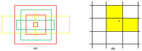 In terms of label assignment, first match the real box with the anchor box aspect ratio and increase the positive sample number on the basis of the nearest center. If the aspect ratio falls within a certain range, as shown in Figure 4a, the anchor box is the red square in the middle, with another red square inside and outside. The ratio inside to outside is 1/4 and 4, respectively, with a range of four times. As long as the width and height of the real box fall within the range of the inside and outside, it is considered a match and the anchor box can be used to predict the real box. The green box in the figure indicates a successful match, and the yellow box indicates a failure. To further increase the number of positive samples, the two grids closest to the center of the real box also make predictions for the real box, as shown in Figure 4b.