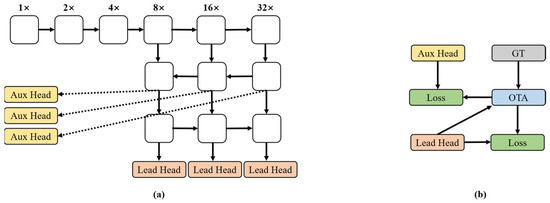 During the training process, YOLOv7SAC utilizes a deep supervision technique, where the shallow features are extracted from the header as the auxiliary header, and the deep features of the final output of the network are used as the guiding header, as shown in Figure 5a. The losses from the auxiliary and lead heads are fused, equivalent to performing a model ensemble operation at the network’s high level, which enhances the overall model performance. When computing the loss, the lead head calculates loss independently, while the auxiliary head takes the positive samples matched by the lead head as its own positive samples and calculates loss. Finally, the losses from both heads are added according to different proportions, as shown in Figure 5b.