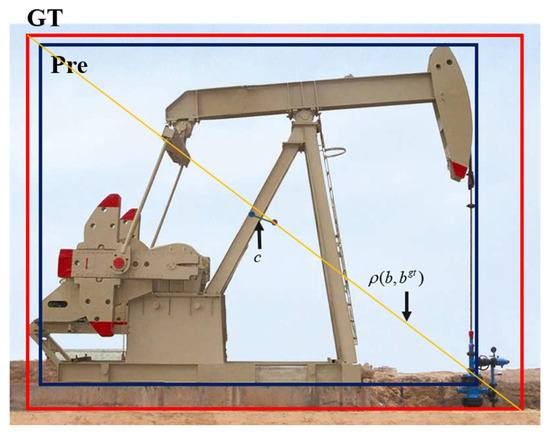 where is the CIoU loss value, represents the ratio of the areas where the real frame intersects and merges with the prediction frame, represents the Euclidean distance between the center points of the prediction frame and the real frame, and represent the width and height of the prediction frame and the real frame, respectively, as shown in Figure 6.