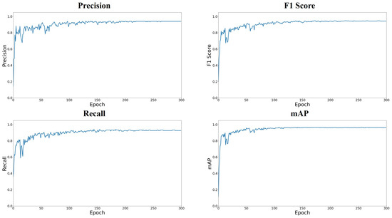 In this study, metrics such as precision, recall, mean average precision (mAP), and F1 score were employed for the objective assessment of the model’s performance. Precision, a commonly used evaluation metric, is calculated as the number of correctly identified targets divided by the total number of detected targets. Generally, higher precision indicates better detection performance. However, elevated precision does not always signify overall effectiveness. Therefore, additional metrics such as mean average precision, recall, and F1 score were introduced for a comprehensive evaluation. The formulas for precision, recall, mean average precision, and F1 score are as follows:
