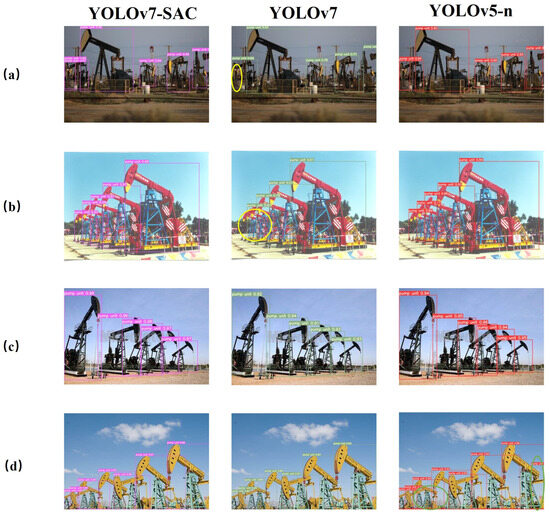 In order to examine the generalizability of different models for pumping unit image detection, the optimal network weights trained by each model are used to detect the data in the test set. In practical application, the detection of a pumping unit needs to ensure the correctness of certain detection, reduce the extra operation brought by the wrong detection, and affect the economic effect. Therefore, the confidence threshold of the detection results is set to 0.4, and the detection effect of each model is shown in Figure 10. The figure shows the detection effect of four scenes; (a) represents the detection effect of pumping units at different scales, (b) represents the scene in which multiple pumping units overlap and block each other, (c) represents the scene in which the pumping units are observed from different angles, and (d) represents the scene in which the pumping unit image does not completely show the overall outline of the pumping unit. Here, the yellow circle represents the pumping unit that has a missed detection, and the green circle represents that the non-pumping unit object is wrongly detected as a pumping unit. From the detection of these scenes, it can be seen that YOLOv7 SAC can detect more pumping unit targets while ensuring the correct detection rate, compared with the YOLOv5-n and YOLOv7 algorithms.