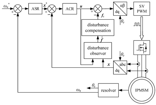 The interior permanent magnet synchronous motor (IPMSM) has been widely utilized due to its simple structure, high efficiency, high power density, fast response and other excellent features [1,2]. Among the IPMSM control methods, the field-oriented control (FOC) is most widely applied due to the features of low torque ripple, fast response and high control precision. At the same time, the double-loop structure of FOC can control the torque and magnetic flux independently [3,4,5]. The inner current loop determines the dynamic and steady-state performance of stator currents [6,7]. However, IPMSM is a nonlinear and strong coupling system and contains unavoidable and unmeasured disturbances such as possible parameter variations in operating [8,9,10]. Moreover, the inverter includes nonlinearity such as dead time, voltage drop and other factors [11,12]. These unideal factors, which are usually ignored in motor control system modeling, will affect the current control accuracy and cause controller parameter mismatch. It is difficult to meet the high performance requirements of the IPMSM control system using traditional control methods.