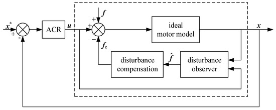 Disturbance observer is an effective method to solve the current controller mismatch. After the lumped disturbance f is estimated by the disturbance observer, disturbance compensation controller can eliminate the disturbance influence efficaciously. The block diagram of the IPMSM control scheme with disturbance compensation is shown in Figure 1, where ωe* is the reference value of the rotating speed speed, x* is the reference value of current, is the estimated value of the lumped disturbances f, and fc is the disturbance compensation value obtained by .